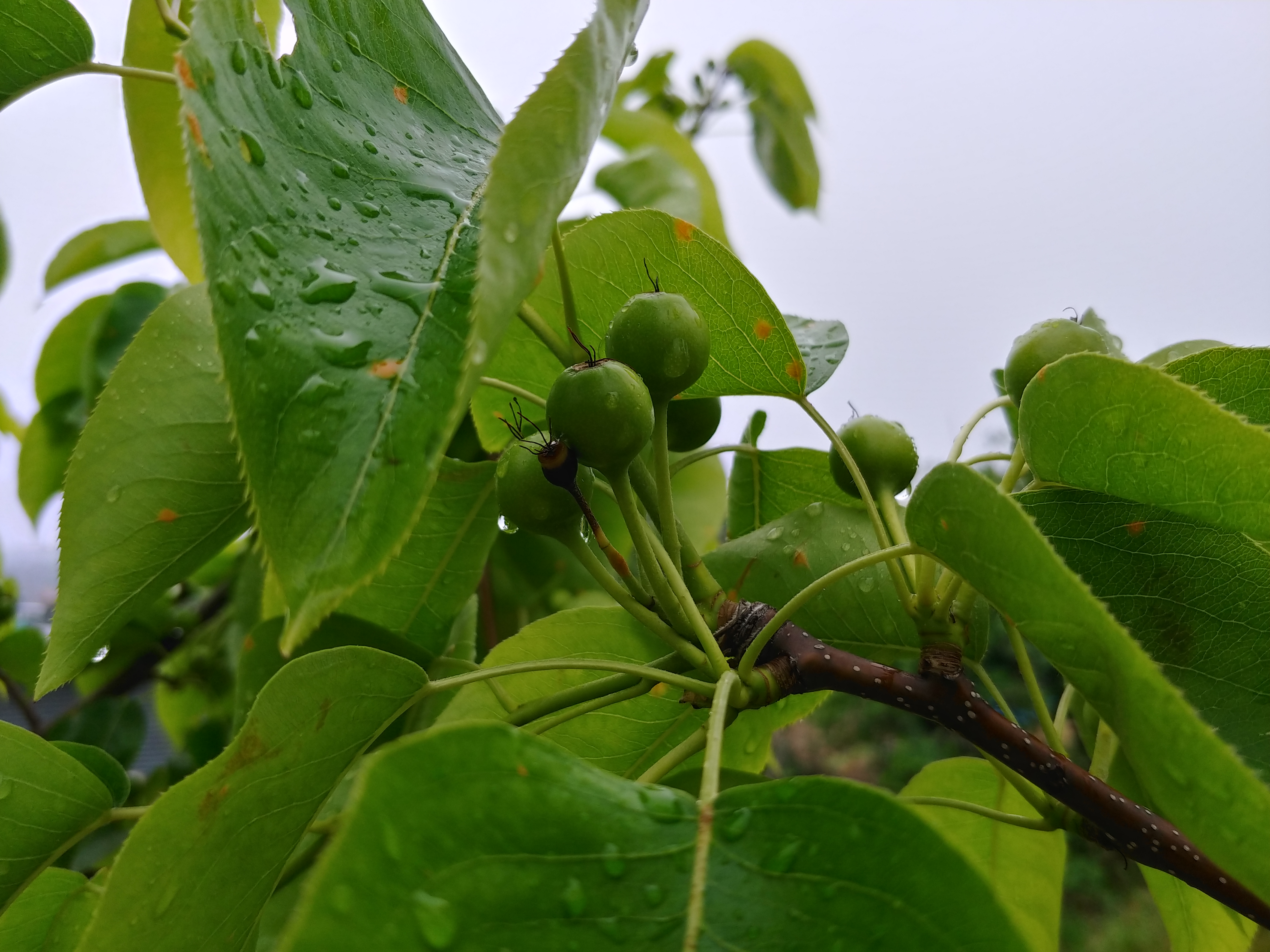 복숭아. 자세히 보면 뽀얀 털이 보송보송 나있다. 잎에도 약간의 복숭아빛이 섞여있다.