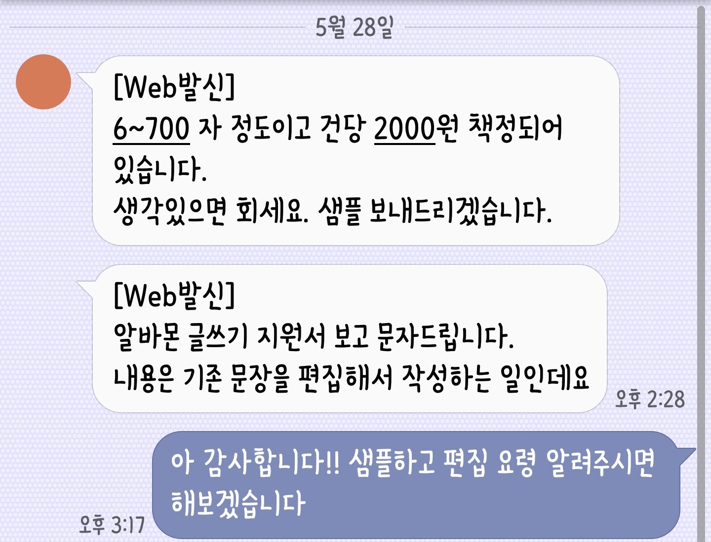 알바몬에서는 분명 건별 5천 원으로 되어있었는데 문자 연락으로는 2천 원을 불렀다. 일단 해보고 싶은 마음에 페이는 눈에 들어오지도 않았다. 메모장 파일의 750자 정도 되는 테스트 원고를 받아서 편집했고 바로 통과가 되어 일을 시작할 수 있었다. (테스트 원고는 대가가 없었다)