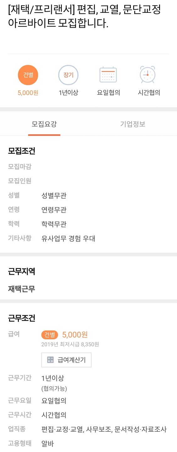 집에서 할 수 있는 원고 알바를 찾다가 원고 편집, 교열, 문단 교정 알바를 발견했다. 원고 분량이나 편집 방식이 어떻게 되는지에 대한 자세한 설명은 없었지만, 건당 5천 원이라고 하니 괜찮을 것 같아 지원했다. 하루 이틀 연락이 없길래 안 됐나보다하고 잊어버렸는데 6일 만에 문자가 왔다.